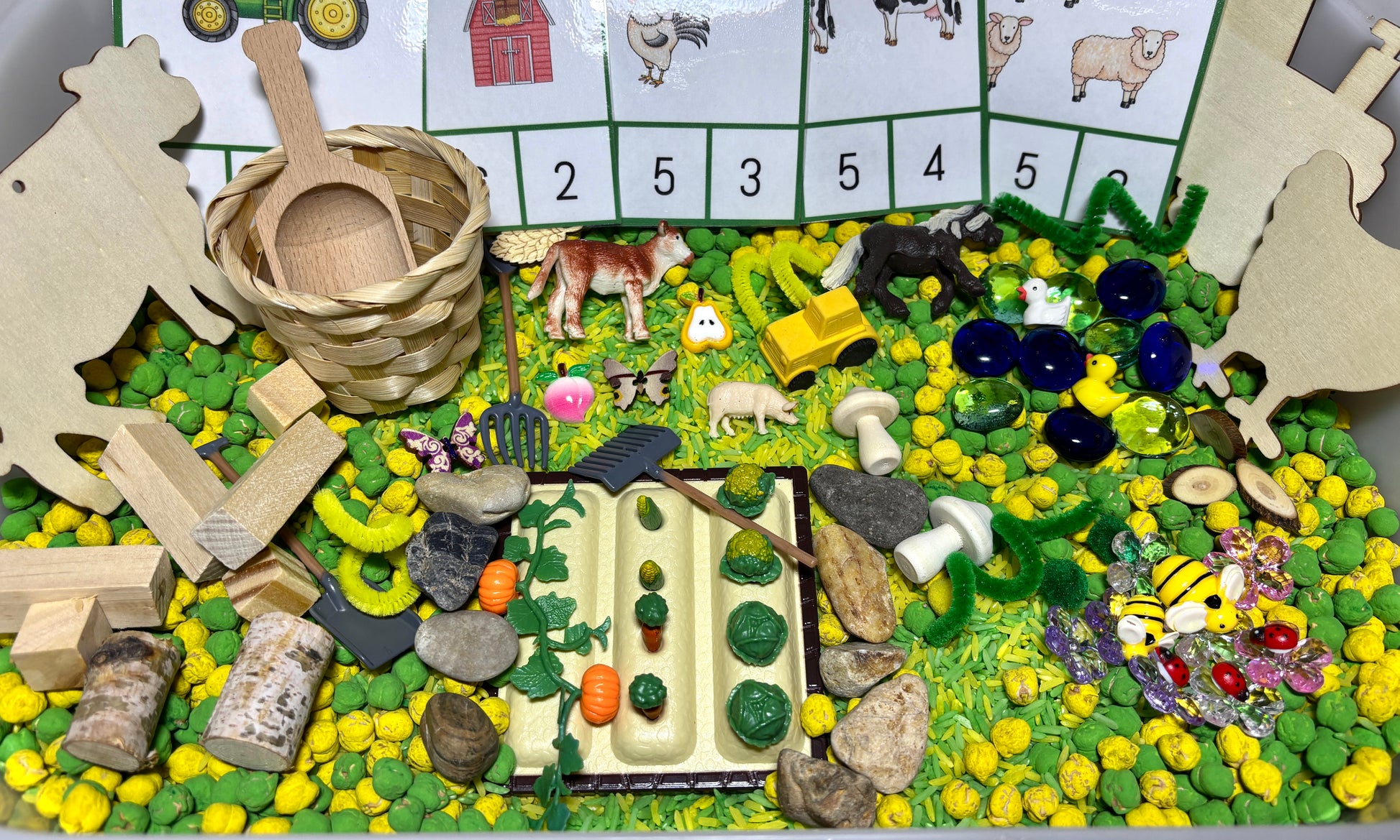 Get ready to play farmer with this exciting farm kit! It includes everything you need to build, plant, and harvest. Plus, there are plenty of opportunities to learn through play - you'll be counting and scooping your way to success with included numeracy cards.