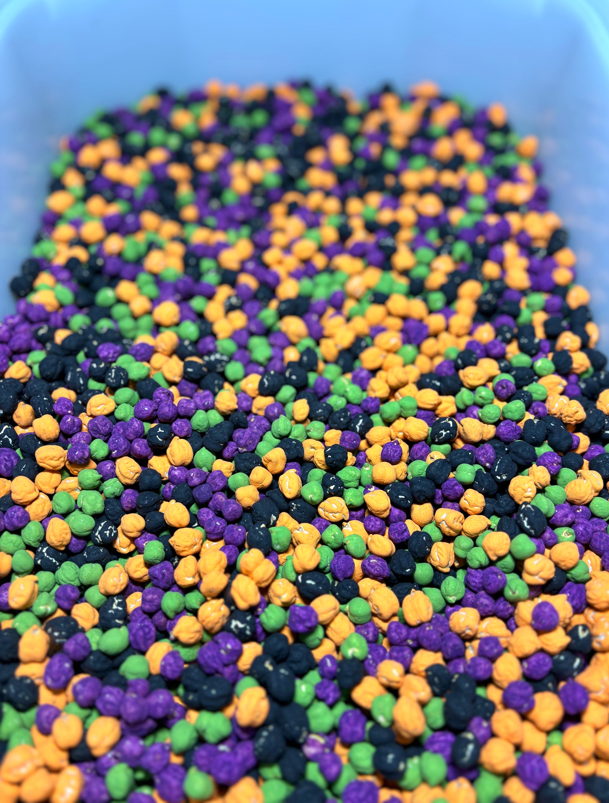 Filler Items: Chickpeas. All mixes are coated with either non-toxic acrylic paint/non-toxic liquid watercolors/food coloring. Colors may vary from batch to batch.